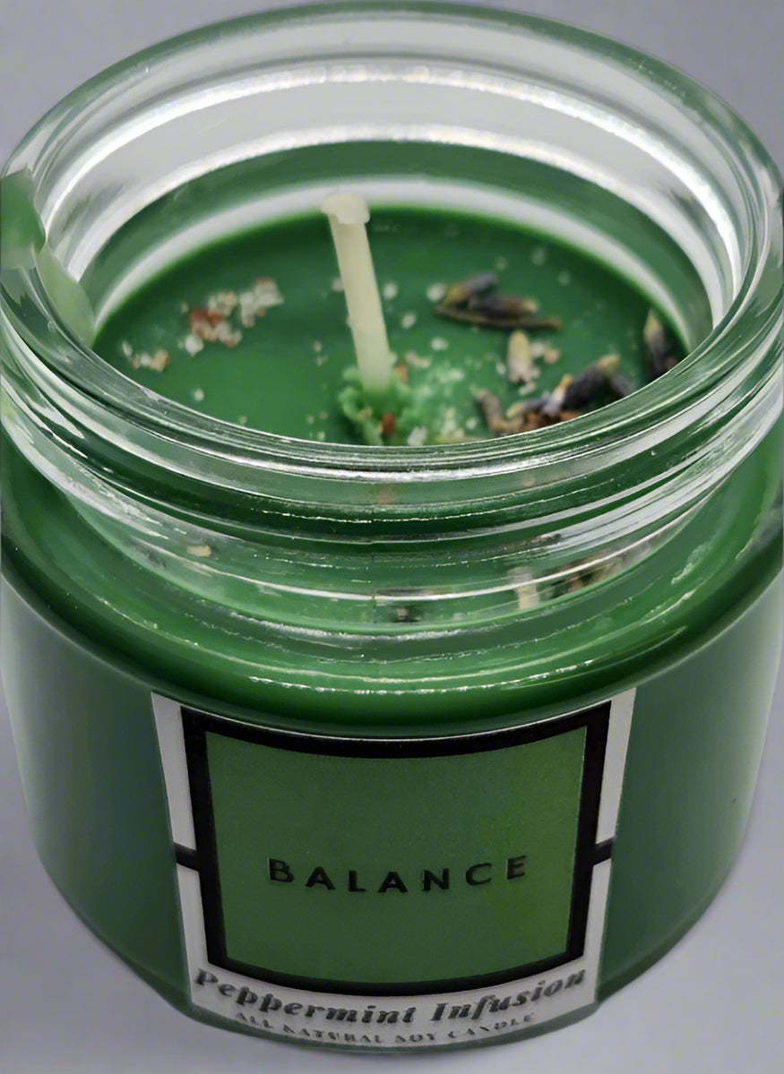 Balance is our best-selling fragrance. The fresh aroma of our Peppermint/ Lavender Infusion is now available in this mini candle. Perfect for travel, small space and gift giving. Made without harsh chemicals, all natural. About 4 ounces.